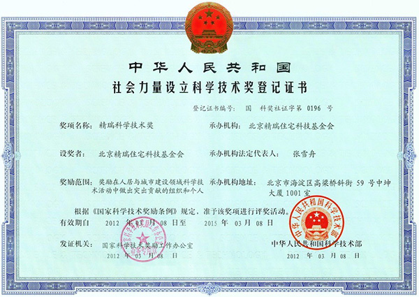 精瑞科學(xué)技術(shù)獎簡稱“精瑞獎”,是人居領(lǐng)域唯一全國性科技獎項,是經(jīng)國家科技部、國家科學(xué)技術(shù)獎勵工作辦公室批準,是國家社會力量設(shè)立科學(xué)技術(shù)獎的重要組成部分,已成為中國人居與城市建設(shè)領(lǐng)域最具權(quán)威性、專業(yè)性與示范性的獎項。