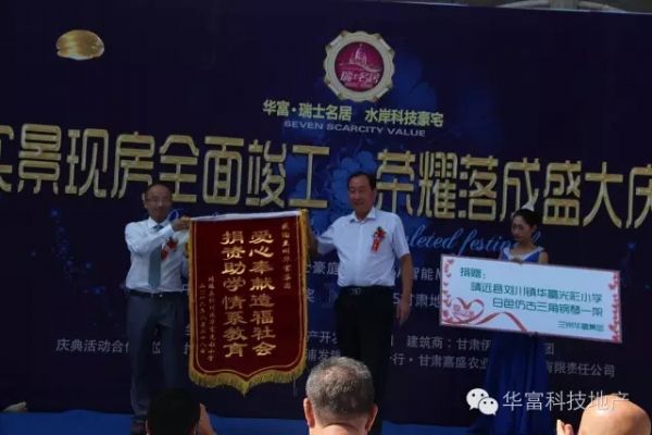 原甘肅省委常委、常務(wù)副省長(zhǎng)郭昆,甘肅省政府參事室主任李 志榮,原甘肅省社會(huì)科學(xué)院黨委書(shū)記、現(xiàn)省政府參事馬琦明, 省工商聯(lián)巡視員張勇,甘肅農(nóng)業(yè)大學(xué)林學(xué)院院長(zhǎng)李廣,省房地 產(chǎn)業(yè)商會(huì)副會(huì)長(zhǎng)、省人大代表、甘肅伊真建設(shè)集團(tuán)董事長(zhǎng)張國(guó) 軍,華富(瑞士)醫(yī)康院院長(zhǎng)范順才,省政府參事、全聯(lián)房地 產(chǎn)商會(huì)副會(huì)長(zhǎng)、甘肅省房地產(chǎn)業(yè)商會(huì)會(huì)長(zhǎng)、蘭州華富集團(tuán)董事 長(zhǎng)陳啟建,蘭州華富集團(tuán)副總裁馬信遠(yuǎn),靖遠(yuǎn)縣劉川鎮(zhèn)教育管 理中心書(shū)記宋廣愛(ài)等領(lǐng)導(dǎo)嘉賓及省內(nèi)外各大媒體共同出席了慶典,見(jiàn)證這一震撼人心的時(shí)刻。