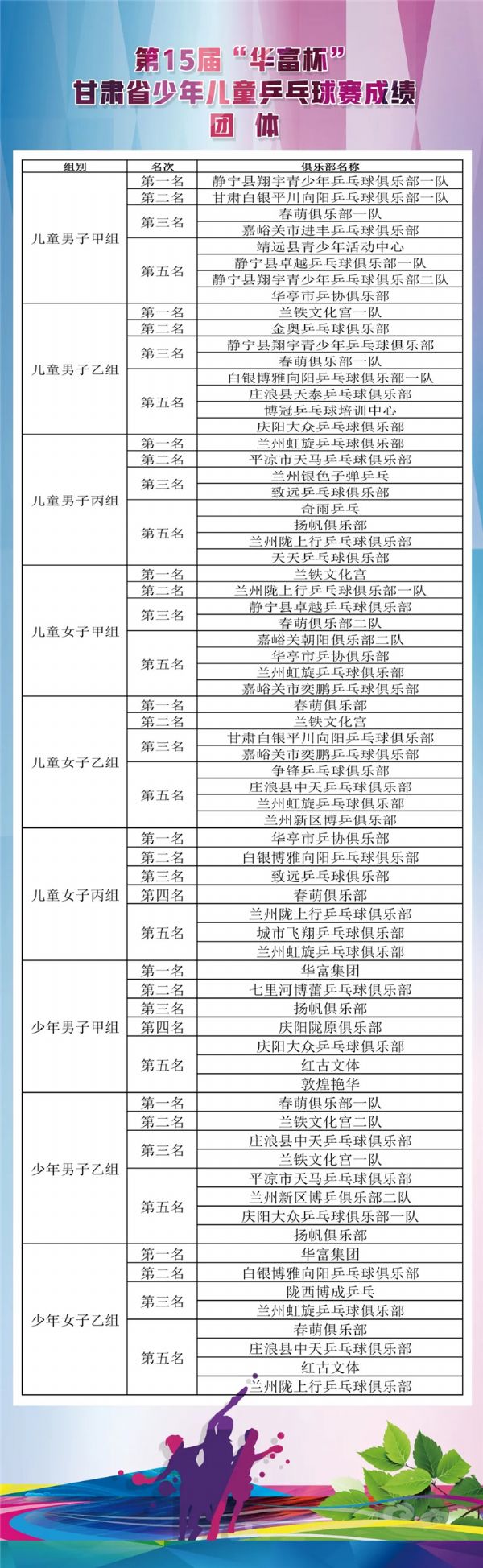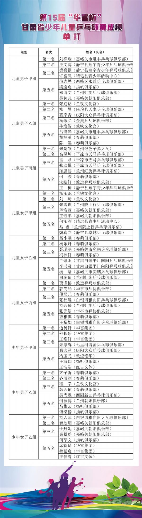 第十五屆“華富杯”甘肅省少年兒童乒乓球賽成績
