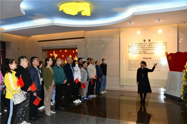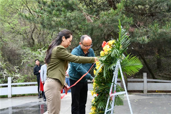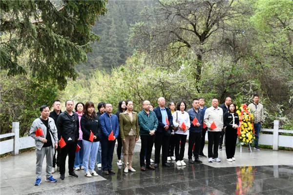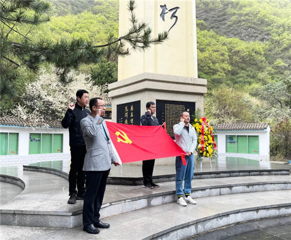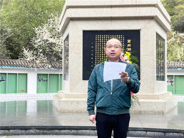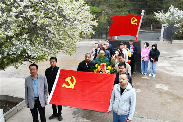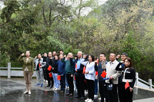 14日上午,全體人員佩戴黨徽、手持黨旗,在烈士紀念碑下全體肅立,奏唱國歌,向英烈敬獻花籃,重溫入黨誓詞,認真聽講解員講解烈士們的先進事跡。
